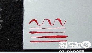 13 接下来我们也试一下画线条,如图,最下面一条是试着把线画均匀,第二条是左至右试着由细画到粗,第三条是试着由粗到细,第四条是保持细细的线,第五条是曲线,但要粗细交替变化,这几种都是很基本的笔法,要试着画好才能好好控制妳的笔喔