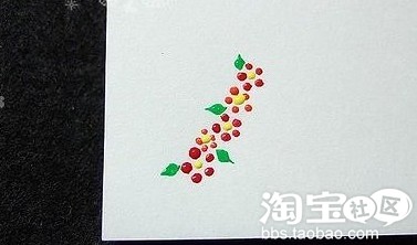 如果觉得叶子和枝藤不好画的话,也可以如左边的甲片,用绿色和白色的颜料,小心的点出一些小点点在花的外围做点缀,点点要有大有小上下交错,位置很重要喔,用绿白点点装饰比较简单,但也是很好看喔