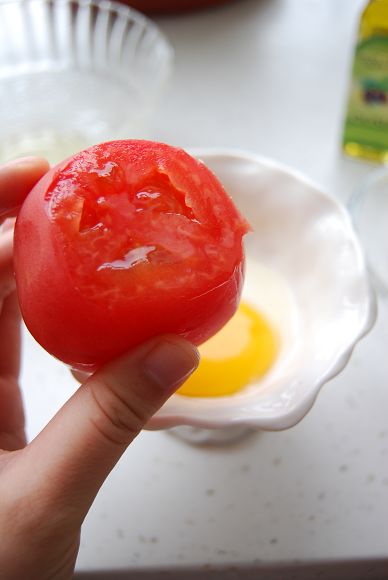 第二步:给番茄切个小帽子,切掉的可以入口了