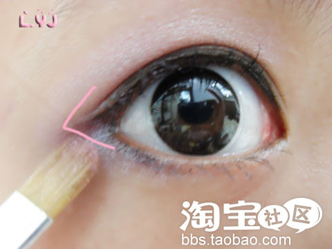 在下眼线的尾端,沿着睫毛根部后段的1/3处画下。。