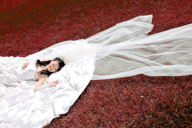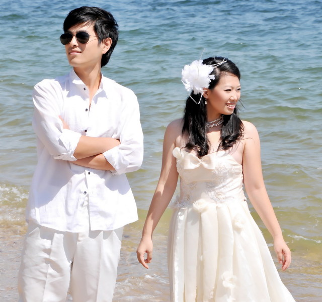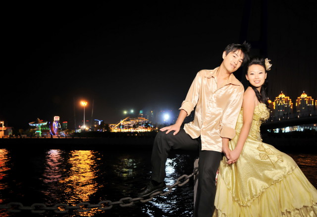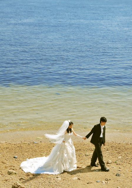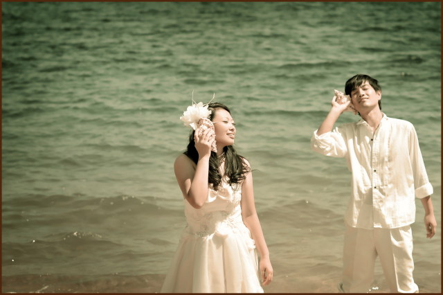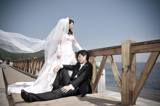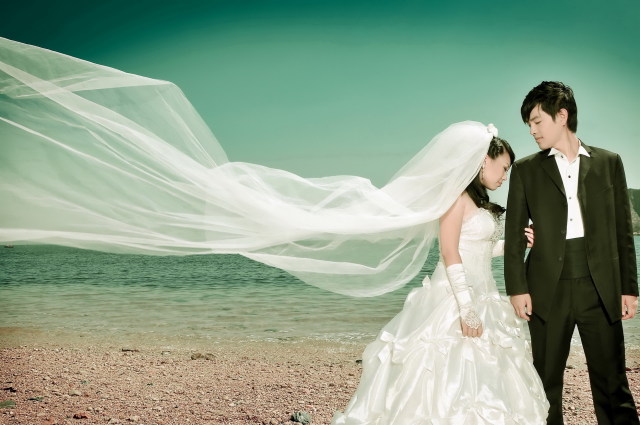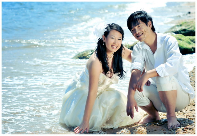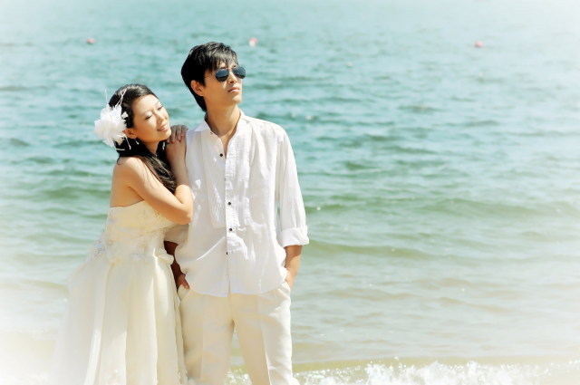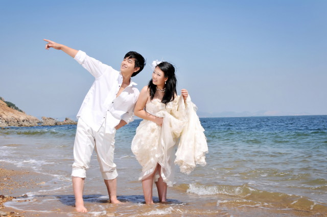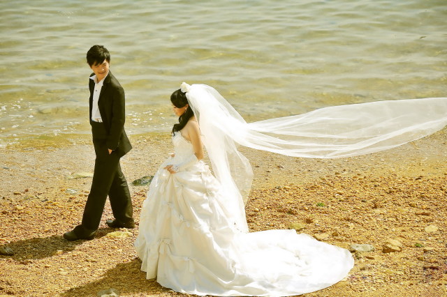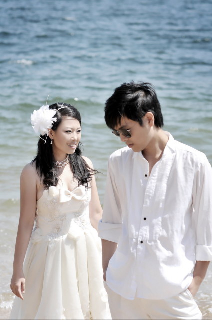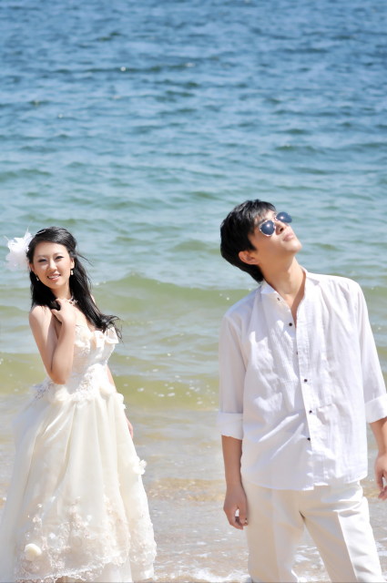1、自驾问题:由于拍外景桂由美是在棒棰岛,所以一般都是几对新人一起,我那天衣服多,外景有5套衣服,所以去得早,自己一个车,我拍片休息的空档第二辆车到了,像变戏法一样从里面出来至少4对新人,注意新娘子可是婚纱头饰全副武装的,很难想象在车里的情景,我一个人一车还觉得裙子底下的撑子没地方放呢。所以几位新娘下来脸色均不好看,其实照婚纱嘛,心情很重要的,心情好以后也有个好回忆不是,所以如果自己有车一定要开车去,换衣服什么的也方便,桂由美在棒棰岛没有基地,所以只能在户外找个转角来换衣服了,而且照婚纱时闲人很多,有点尴尬的