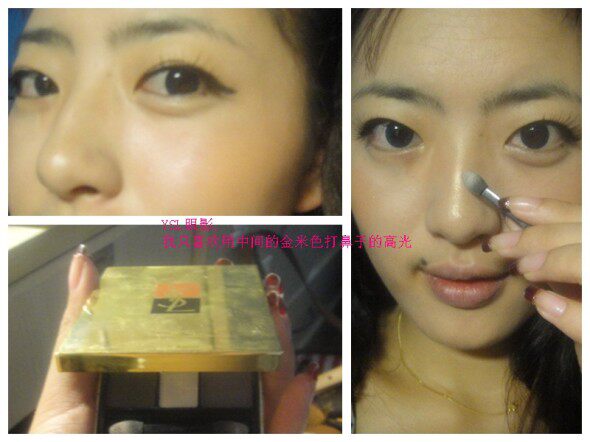 鼻子的高光建议用金米色,在原有肤色的基础上加亮会更自然,不要使用白金色的高光粉