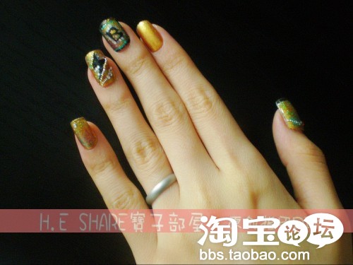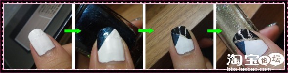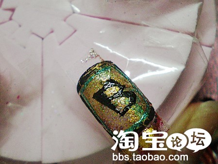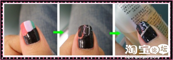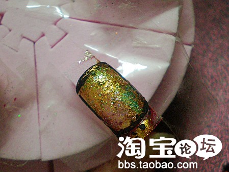 指甲油没干时用笔将蓝绿紫混合,轻轻的扫就可以了