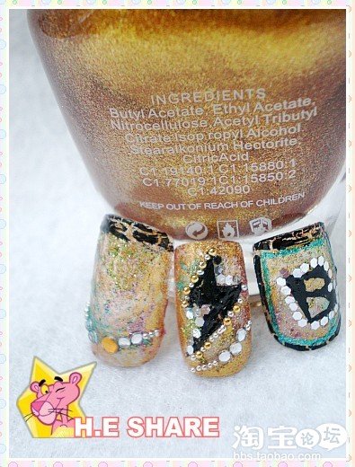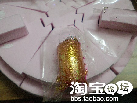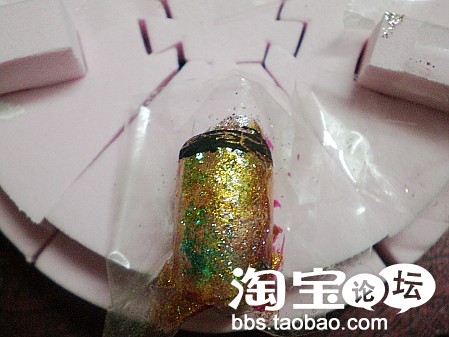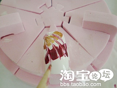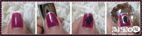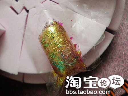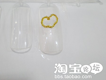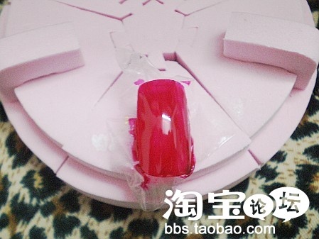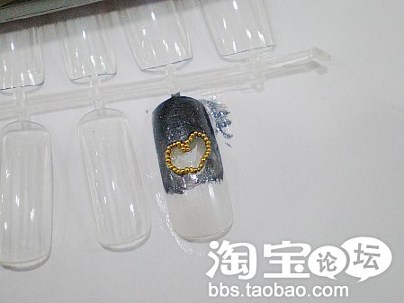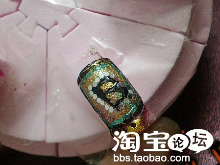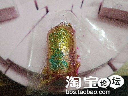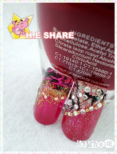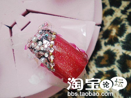 以玫红色的珠珠黏在蓝钻边边,等干了之后再上一层亮油就OK了
