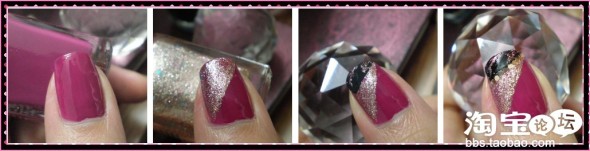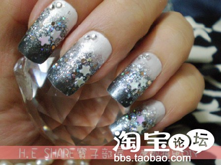 以银闪的甲油涂抹灰黑甲油和透明之间的交界处