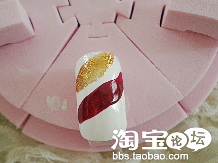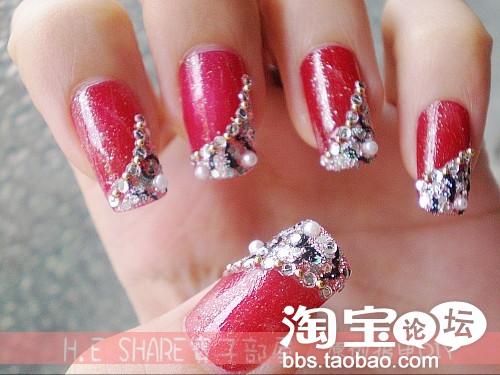 可以利用银色闪粉填充饱满和大一号的银色亮片的透明甲油涂抹红色的地方