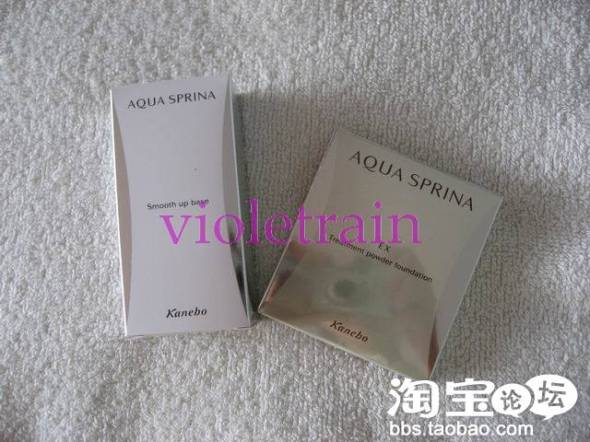 左边是AQUA SPRINA雅呵雅丝睿妆前底乳,右边是AQUA SPRINA雅呵雅丝睿凝时无瑕滋养粉饼。