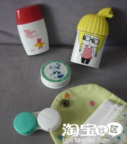 最后是帮助你完善细节,体现细致的特殊呵护物品:近江兄弟小熊防晒乳、DQ防面部汗湿小风扇、防蚊虫叮咬及中暑曼秀雷敦薄荷膏、隐形眼镜双联盒及特殊时期需要的卫生巾包。