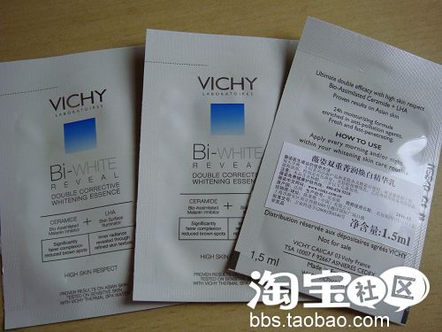 薇姿双重菁润焕白精华乳,呵呵,搞到的小样,这款精华是淡黄色,有点像米白,质地是乳液的质地,不是很厚重,涂在脸上感觉不到有保湿的效果,可能这款主要是美白的缘故吧,不过像我这种混合皮,夏天用也不会觉得干就是了,干皮估计就受不了了,用了几袋下来,觉得肤色有点均匀了,还不错,但很明显的美白效果没发现,继续体验中;个人觉得这款,如果皮肤比较健康,只是有点肤色不均匀,有点暗沉的话,可以考虑哦,价格也不是很高。