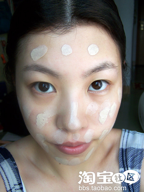 把BB霜薄薄的均匀点于额头、脸颊、鼻子、下巴及人中处