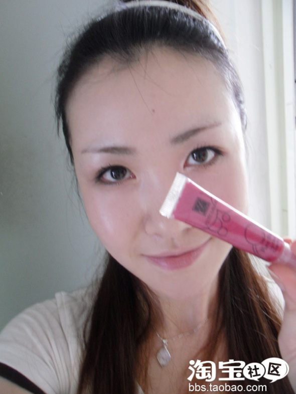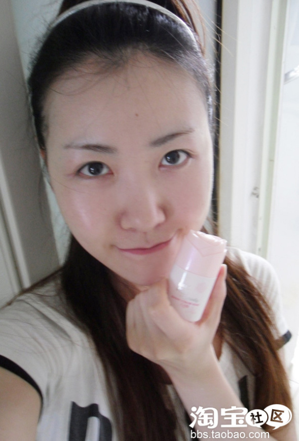 摸一下脸,没有黏黏的感觉就OK了,涂上粉色的玫瑰妆前乳,皮肤看上去粉粉嫩嫩的,可以修饰淡淡的豆印