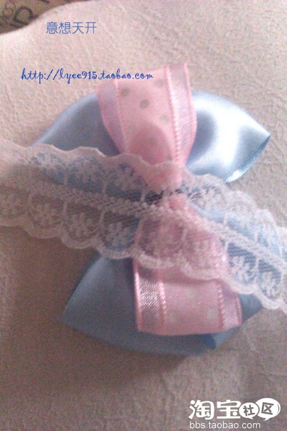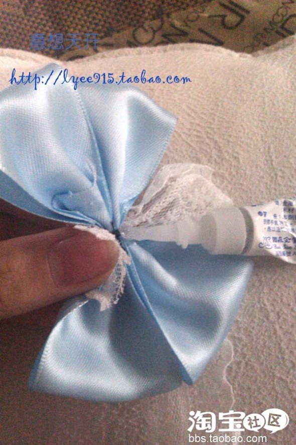 用强力胶黏在背面,注意只要在蕾丝的两端抹一点胶就好了啊,黏在蝴蝶结背面中心,这样从正面就看不出来啦~~~~