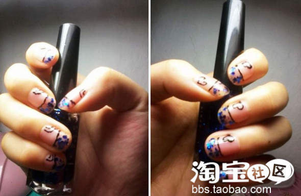 3.用蓝色亮片涂指尖处,再用拉线笔画些小图填充空白