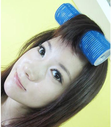 只要上这蓝 色大髮捲,捲上去,两分鐘即可。