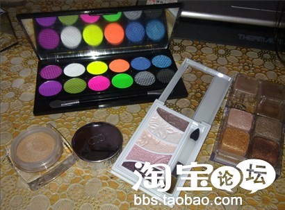两侧的管状的是雅美姿的 五色眼影是兰蔻专柜买的,用的别的牌子的盒子,旁边的那个是紫色的超BLING的闪粉 适合化紫色眼妆的时候撒上一点点 ZA的 忘记什么色号了