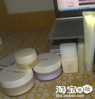 悠莱的散粉,米色属于适用于大面积定妆,紫色用于擦T字部位,可以调整肤色,这种定妆方法尤其适合肌肤暗黄的的MM呢,修颜乳(象牙色)用完不打算用了,像唇膏的那个可不是唇膏哦,是眼部焕活防护棒,可以免受紫外线及不良空气的侵害,抵御肌肤氧化,最后一个是收缩毛孔用的,在毛孔大的地方轻轻拍打才会有效果哦,直接涂抹效果不明显呢