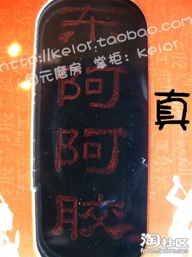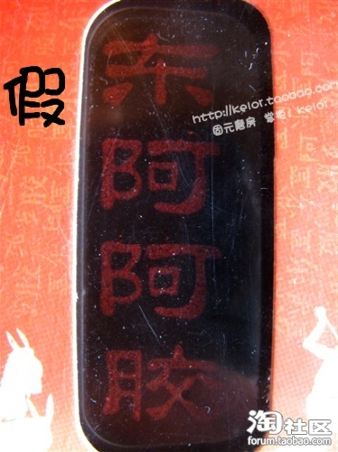 伪品阿胶外包装印刷较粗糙,胶块正面印字一般用漆等物印制,字迹模糊,容易掉色或抹去。