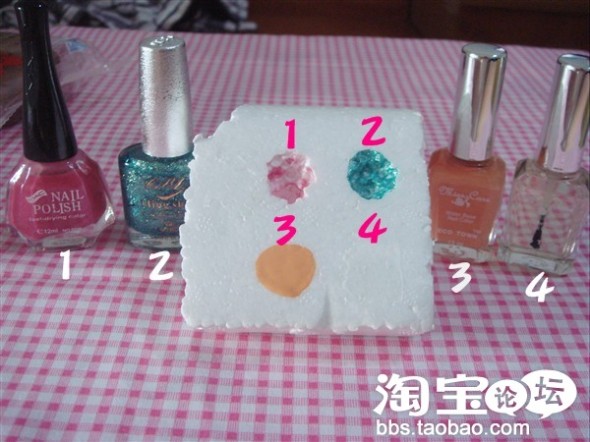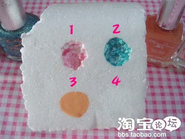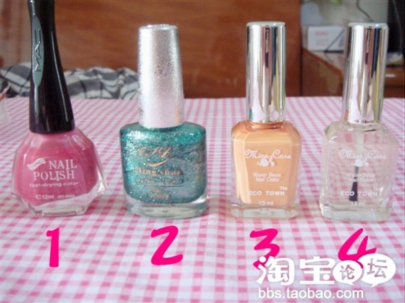 1和2是家里随便拿的两瓶指甲油。(2号甲油买的时候也说是环保的,谁知道还不是一样腐蚀!!哎不能太相信人啊!)3和4是ECOTOWN的环保型指甲油咯。最近我买的还是最便宜的新系列呵~25米