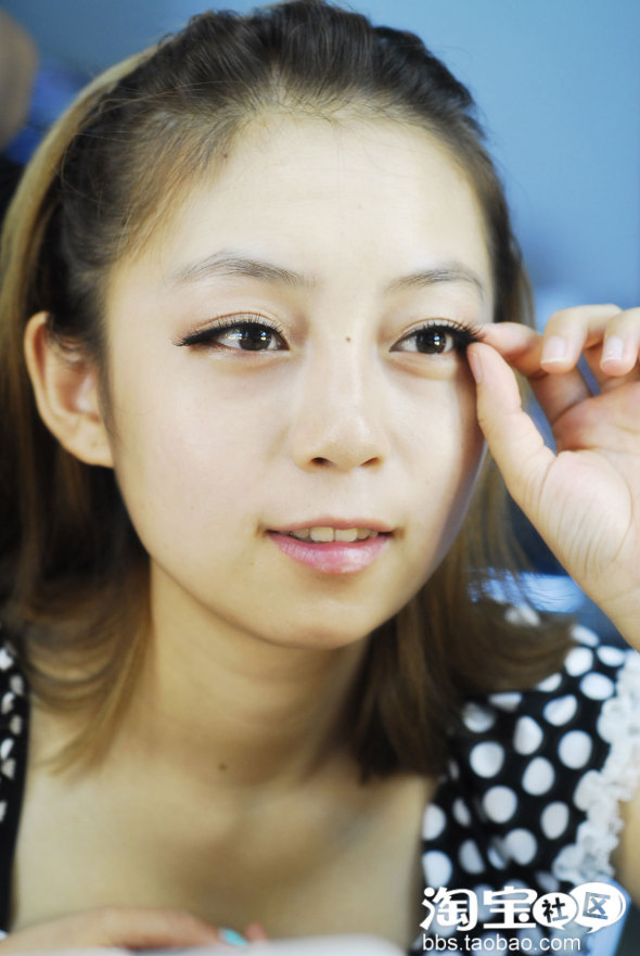 睫毛的尾部往下贴一点点。。。。。这样可爱无辜的下垂眼妆就基本完成哦。。再就是下睫毛。。。