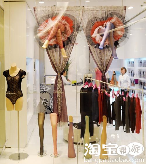 内衣、袜子等品类陈列有一定的特殊性,这是个以产品为主题的橱窗,弱化了故事性。内衣选择体现了今年的流行趋势——彩袜和蕾丝。幔帐垂下,突出了女性的柔美和性感,而腿模的姿势也十分诱人。