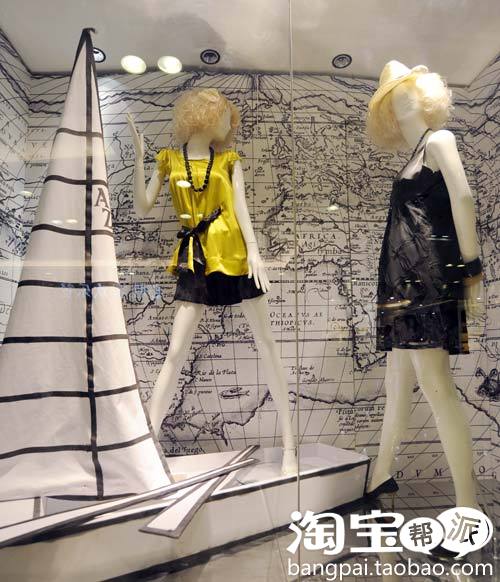 这是一个有故事的橱窗。在世界地图和游艇的世界里,阿桑娜主题橱窗充分展示出旅行主题,背景和道具的白色和黑色很好地衬托了模特穿着的服装。橱窗也在提倡一种生活方式和一种理想,即穿着阿桑娜的客人永远享受着旅行。