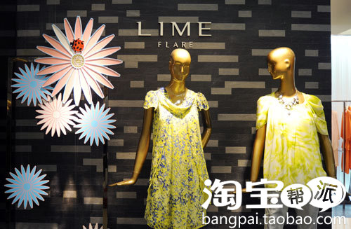 莱茵品牌这季主推黄色印花裙装和上衣,配合产品和春夏的氛围,将产品上的印花或是提取某些元素放大组成了一个橱窗,更加说明该品牌的目标客群不是天真浪漫的小姑娘,而是相对理性的熟女。花朵上方的红色瓢虫增加了趣味和生活性。很适合橱窗预算不高的品牌效法。
