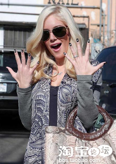 诀窍:当你“穿金戴银”时,黑色指甲油是绝佳的选择。其实也就是一个简单的对比法。其它地方都很耀眼了,指尖压一压色,可以让人显得沉稳不少。