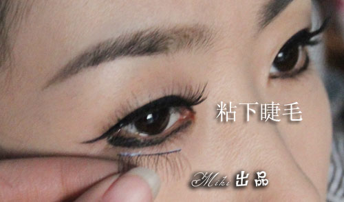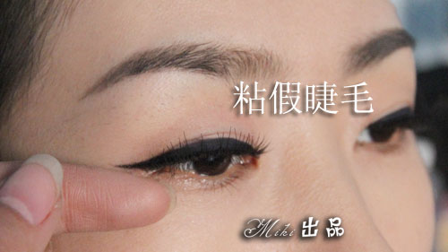 下面的步骤,就是要粘假睫毛了。呵呵。。压着眼线粘,在粘好以后,用手指轻轻把睫毛根向上推,这样能让睫毛的弧度更翘,效果会更好。