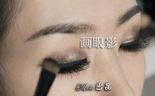 粘好假睫毛以后,接着就是要画眼影了。摩登女郎,还是主要以突出气质为主,所以选了一个比较常用的金棕色,很漂亮。画的时候还是要注意过度,最靠近睫毛根的地方最深,越往上颜色越淡哈~下眼影同样的,也是和眼线一样,整个一条都画。但是不要画太宽。