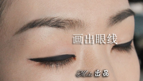 下面,我们要画眼线了。这次的主题是摩登女郎,所以眼线不要画的太挑,那样会显得不那么气质。但是又要把眼睛加大,所以在把眼线加粗的同时,在眼尾的处理上,只需要平着向后延伸就好了,这样也可以把眼睛加大,但是不会显得很轻佻。
