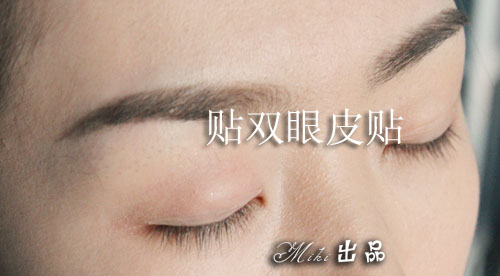 恩。为了让眼睛看起来更大,我们需要贴一下双眼皮贴,把眼睛撑开。贴的时候,要压着本身内双的那条褶皱痕迹贴,这样等于是把原先的痕迹盖住,从上面重新塑造一条褶皱线。恩。如果要是贴一条觉得眼睛还是不够大,那么我们可以再贴一贴,第二贴的下面边缘压着第一条双眼皮贴的上面边缘,这样叠在上面再贴一贴。这种叠加的贴法好处就是不会把下面的压下去,看起来更自然。