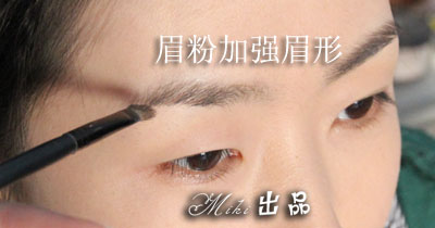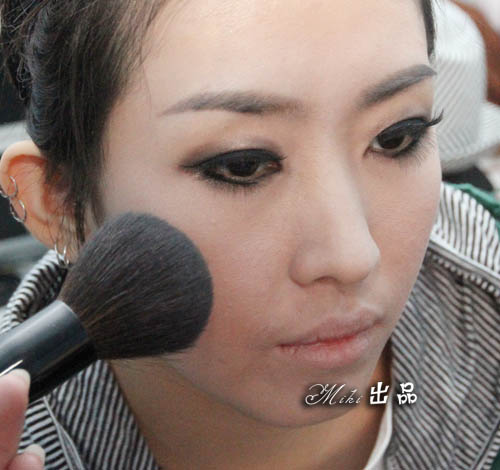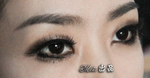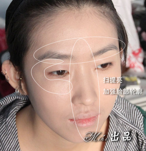 恩,有MM会问,为什么这次的提亮位置和上次帖子里的有些不一样呢?呵呵,这次和上次的区别,主要是在颧骨上限和眉骨那里的半圆弧形,我们是一起扫下来的。这样和T字区的提亮一起打,可以使得眼窝看起来更凹,眼睛轮廓感更强。至于为什么这次的妆要眼睛轮廓打深呢,别着急,往下看~