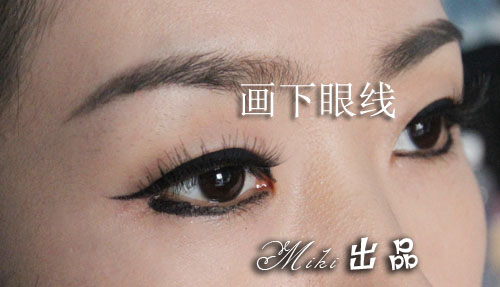 然后把下眼线画好,这次的下眼线和以前不同,采用的是全包式眼线,也就是说整条下眼线都要画,但是还是要注意过度,眼尾的地方粗,眼头的地方细,这样和上眼线呼应,会显得眼睛更大。