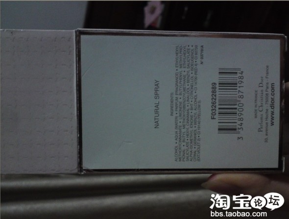 香水是别人送的购于化妆品店,可能是类似于千色店那种吧,我没有用过Dior的香水,感觉包装瓶子都不是很精致的,尤其是包装,好粗糙,不过这只是我自我感觉,可能期望太高,但是我先前卖的CK,菲拉格慕包装都比这个精致吧,香味也不是很惊艳,我觉得特点不大,喷在皮肤上能留半天吧,衣服上一天下来闻基本没味道了,总感觉留香时间还不如CK,这应该不是Dior的品质啊,,,难道买到A货了,呜呜呜