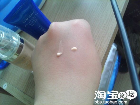 在手上轻轻的拍开,水之印被皮肤吸收的很好,看起来也很细腻;欧莱雅的泛白,和皮肤贴合度不够好,有点干