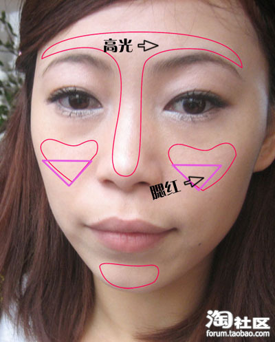 很强的秘密武器!画了张图片呵呵红色的线条是涂散粉与高光的部分!我说下上的顺序 :1.先在红色线条内涂散粉要少轻薄快速。2.在粉色的先框内也是就是三角区涂腮红。最后在用珠光液在红色线条内再次轻轻的拍打提亮。这样我的眼袋就可以完全的遮盖好了呵呵!照相也不会明显啦!