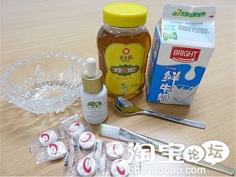 就是这些小玩意儿了!一些新鲜牛奶,一些甜甜的蜂蜜,一瓶抗老精华液,一把小调羹,一把小刷子,一个玻璃碗,一些压缩面膜。。。。。。