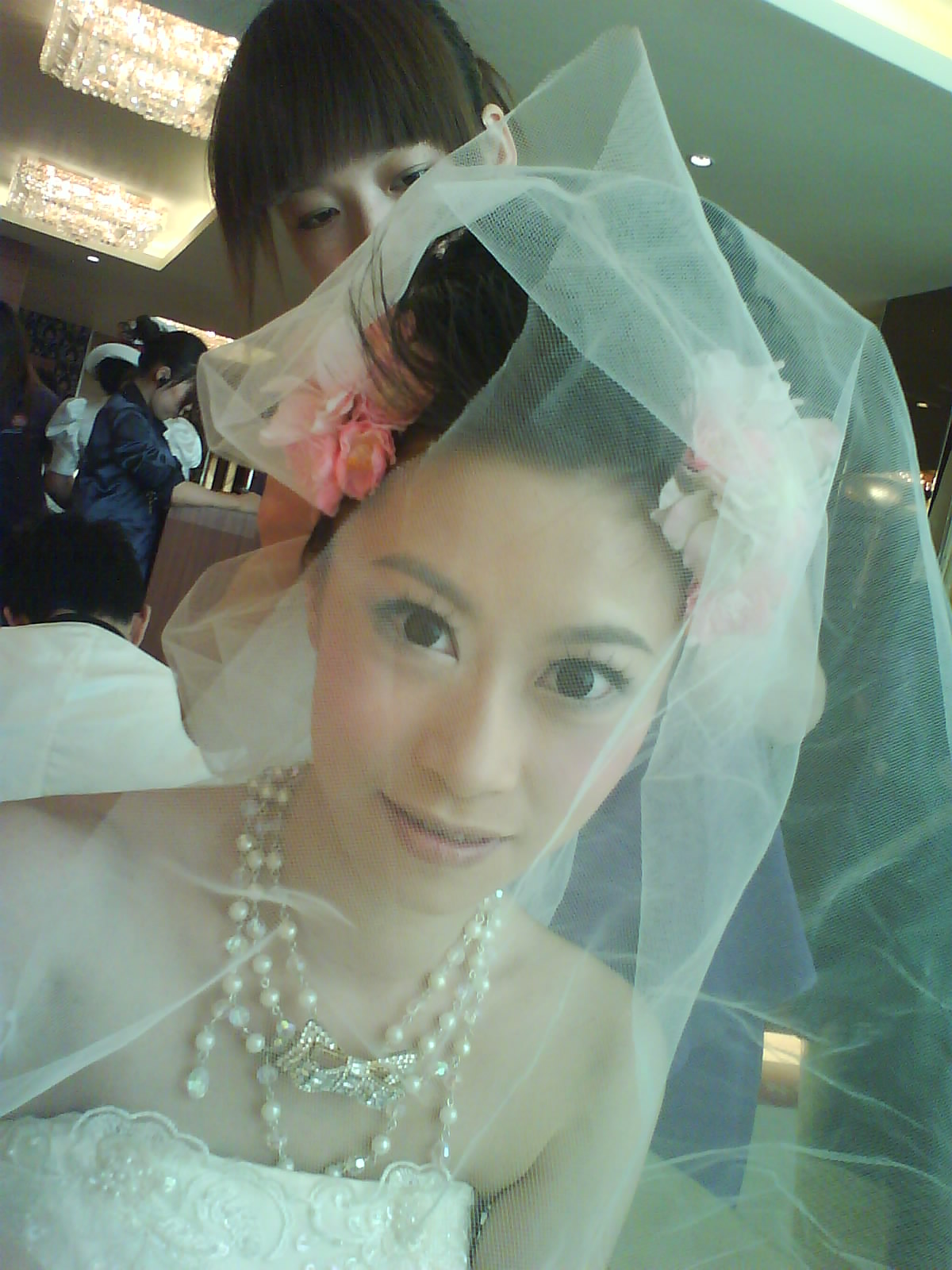 带的是假发,帮我弄头发的mm估计是新来的,动作太慢,我妆都化好了,头发才搞了一点,化妆师连忙找来假发,搞掂!哈哈,短发感觉很清新~