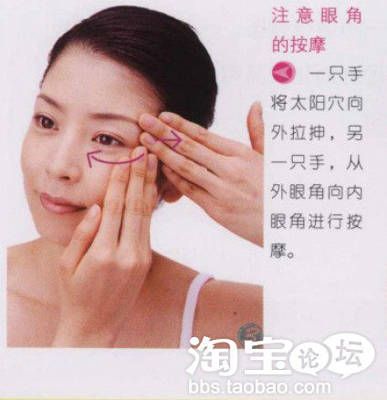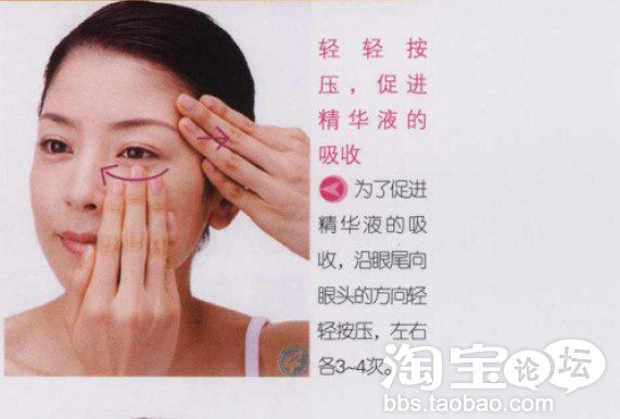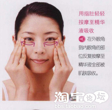 眼部护理时,要将眼部精华液或者眼霜轻轻涂在眼睛周围,涂抹时需要注意的是,一只手按住太阳穴,另一只手要沿着外眼角的方向涂抹。外眼角的皱纹多是从内向外呈放射状的,所以涂抹眼霜的时候就要逆着皱纹生长的方向,从外向内涂抹。