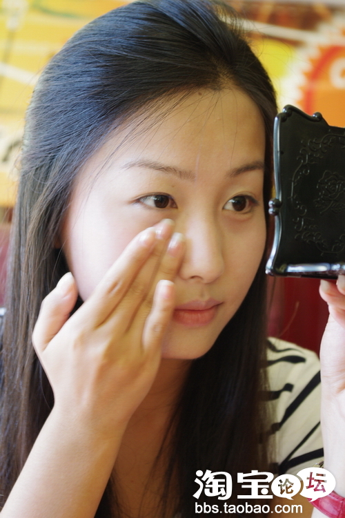 上隔离,模特Becky通常先点再推开最后拍打,这样妆容就更服帖。图下