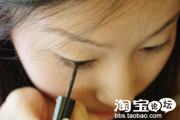 第三步:画眼线。Becky喜欢画眼线时在眼尾略微向上扬,更加俏皮哦。需要注意的是,不要把眼线画的很粗哦,细细的就可以,要的就是自然!
