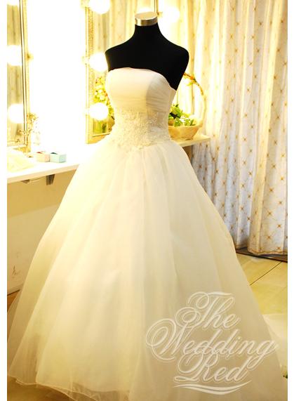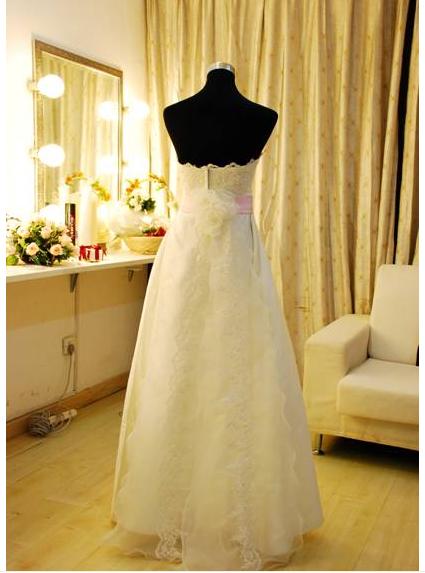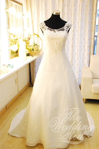 可以挑选腰间具有倒三角形线条设计的婚纱,或是高腰娃娃装设计的婚纱,都能够转移模糊视觉上的焦点。
