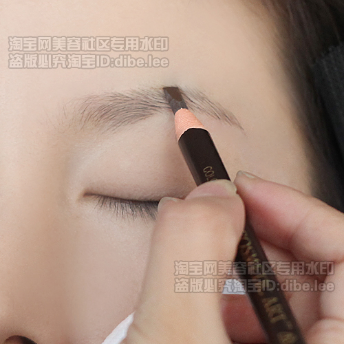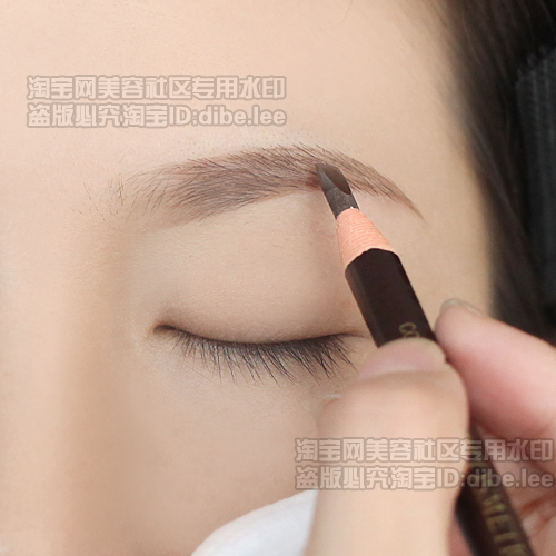 眼妆是重中之重!首先画眉毛第一笔,落在眉峰勾画出眉形.