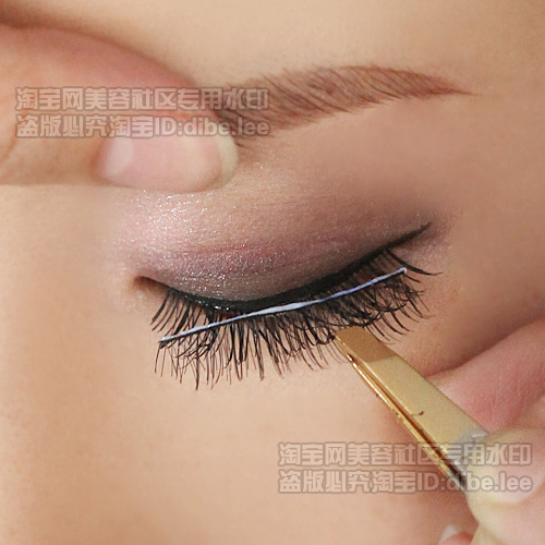 待睫毛胶快干时,先粘中间再粘眼尾,最后粘眼头.