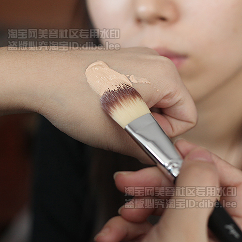 用粉底刷调和粉底液,注意,一定要让粉底刷沾满粉底液.