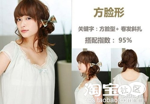 [方臉型] 這種臉型的梳妝要點是以圓破方,以柔克剛,使臉型的不足得到彌補。可將頭發編成發辮盤在腦後,使人們的視覺由于線條的圓潤而減弱對臉部方正線條的注意。前額不宜留齊整的劉海,也不宜全部暴露額部,可以用不對稱的劉海破掉寬直的前額邊緣線,同時又可增加縱長感。兩耳邊的頭發不要有太大的變化,避免留齊至腮幫的直短發。
