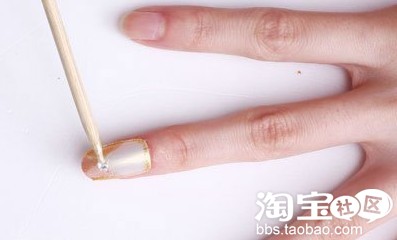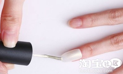 珍珠白色甲油,从指根刷向指尖,先中间后两边。可用透明甲油增加亮泽度。