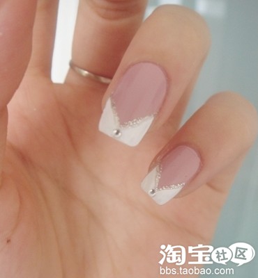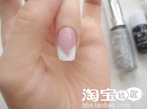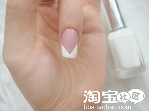 第二步:用白色指甲油画V型法式边