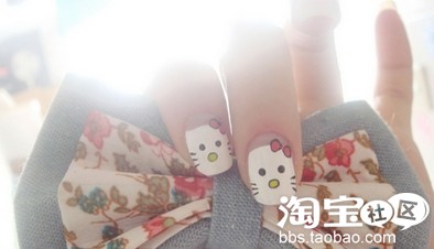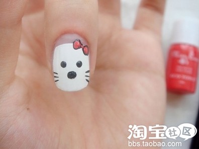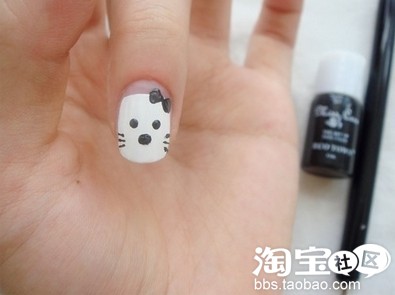 第二步:用黑色浓缩的指甲油画kitty的蝴蝶结