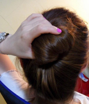 两边头发拧紧后 两手抓住发尾 一起将两股头发放在后脑勺处。